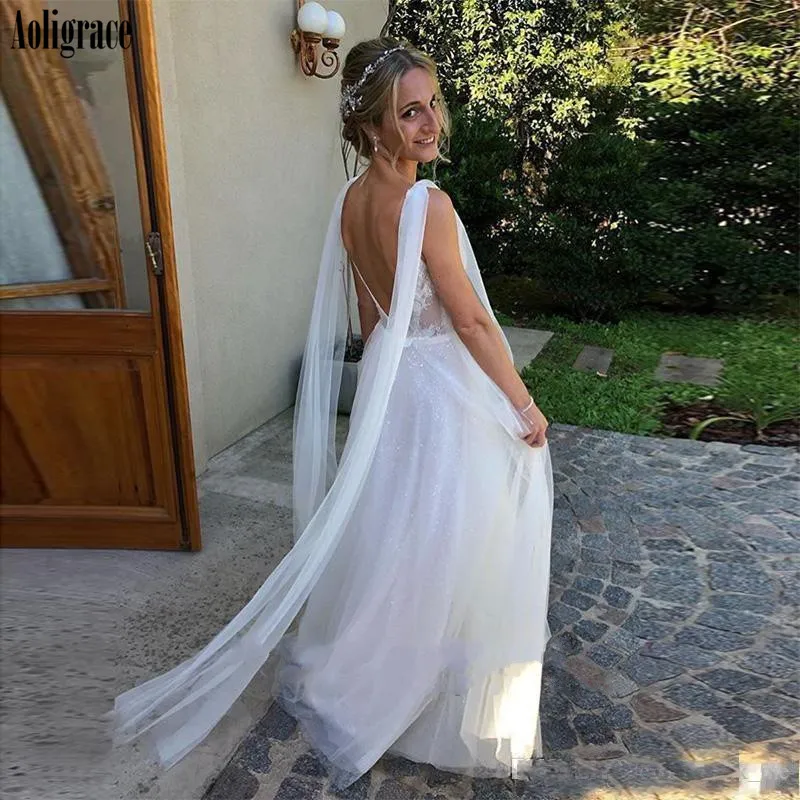 Review Latest Bohemain Lace Wedding Dresses Deep V-Neck Backless Sweep Train Country Bridal Gowns Beach Ga